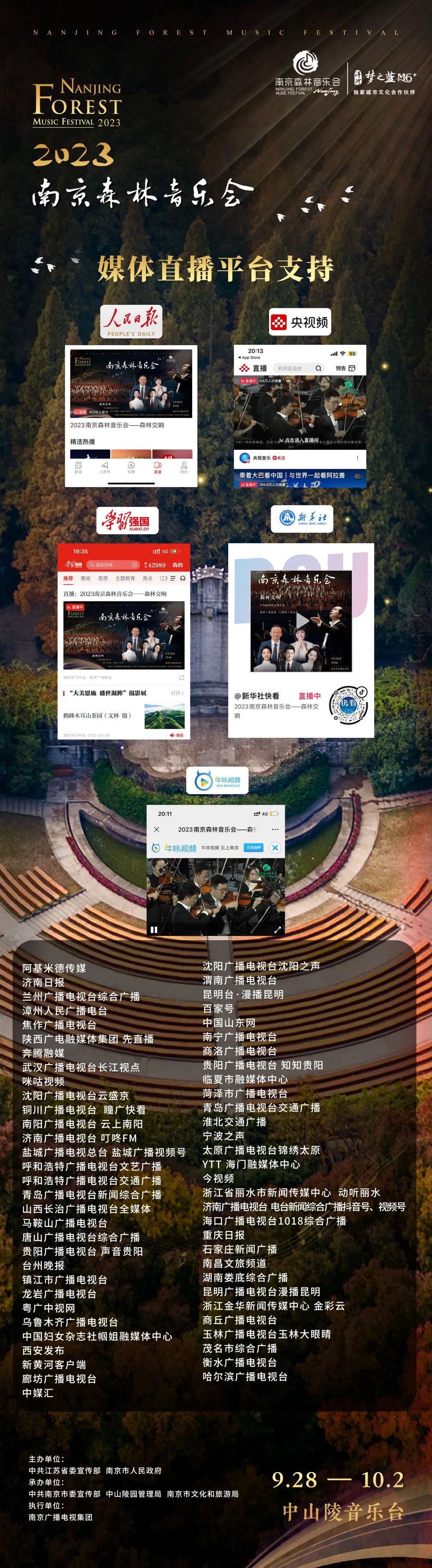 不能到场的观众,可以通过人民日报客户端、新华社客户端、央视频客户端、学习强国、牛咔视频客户端,南京广播电视集团官方视频号、抖音号、快手号、微博、今日头条、南京森林音乐会官方网站、百家号、Bilibili、华为信息流、Live南京城市直播频道和南京电视台娱乐频道等全国近百家媒体和平台收看电视和网络直播。